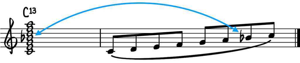 When improvising, jazz musicians select notes and scales that match the chords being played by the ensemble. This is the “playing the changes” technique that Parker initially failed to understand in his performance with Jo Jones. Since upper extension background chords including dominant 7s, the leading tone of a major scale will clash with the notes of the chord. Jazz musicians respond by using modes in their improvisation. In the example below, note that the Mixolydian mode of the C-scale contains every pitch of the C13 chord, including the dominant seventh B♭.