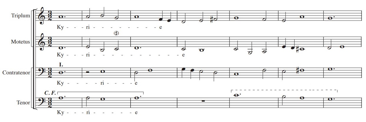 In the penultimate measure of this excerpt, note how the C♯ leads into the D by a semitone, and likewise the F♯ is raised to lead into the G by a semitone. This is known as a double leading tone cadence, distinctive of the Ars Nova style.