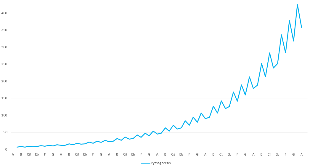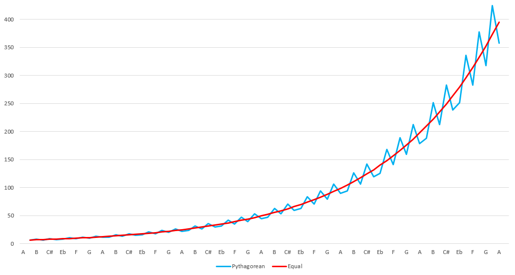 A solution was invented in the early eighteenth century with the advent of equal temperament. In this system, the octaves are tuned at a 1:2 ratio and the frequencies of the other eleven semitones are evenly distributed across the remaining space along the trend line of the Pythagorean intervals.