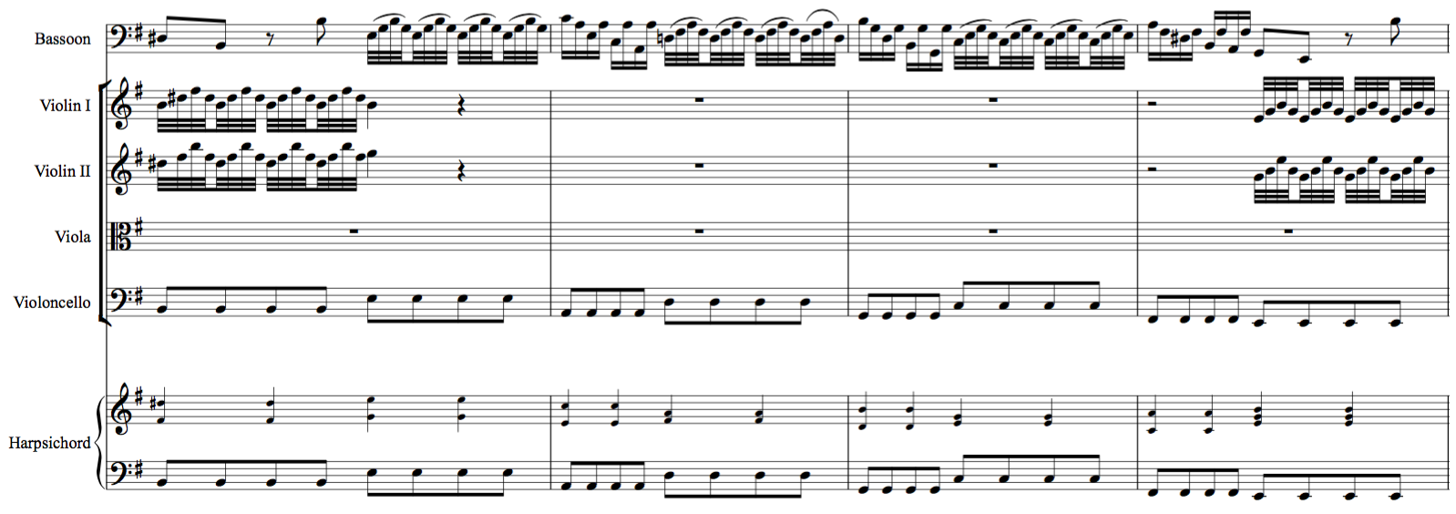 A signature of Vivaldi's style was the use of the sequence, where the chords progression moves down the circle of fifths (or up the circle of fourths.) Due to the physical limitations of meantone temperament (not to mention the patience of the audience), a sequence will usually repeat just a few times before returning to the original key, as seen in the excerpt from his Bassoon Concerto in E Minor.