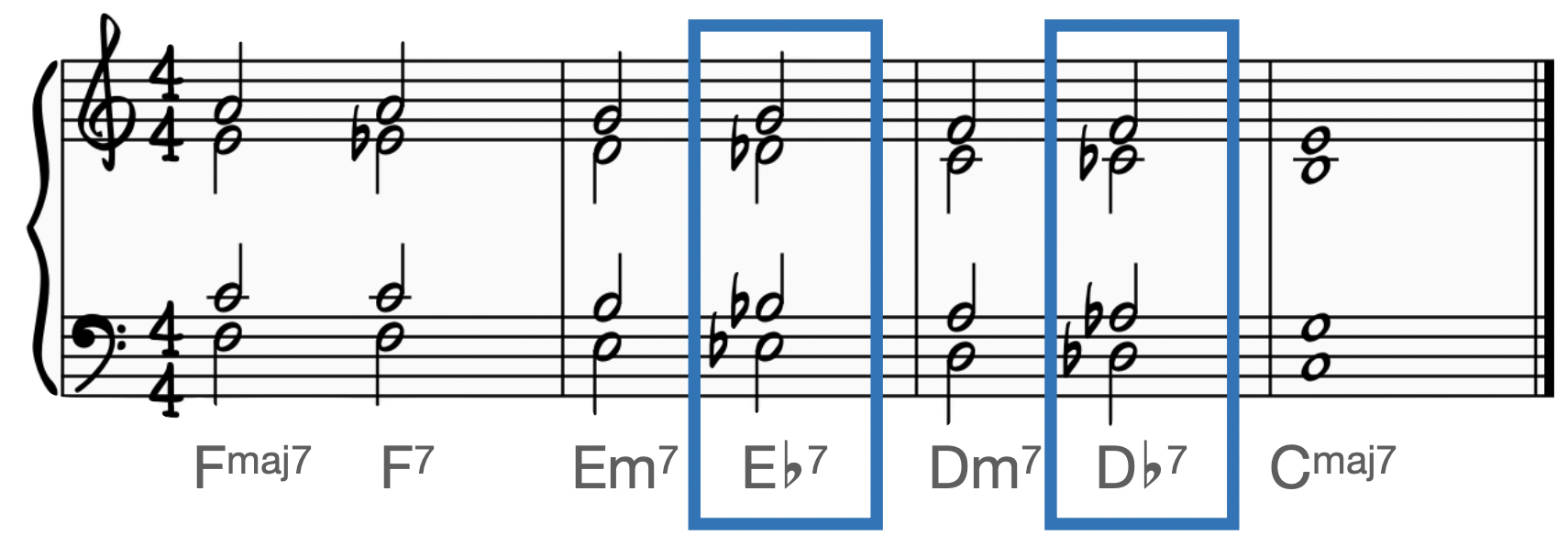 A ii-V-I progression is sometimes modified with a tritone substitution. In a V7 chord, the third and seventh are a tritone apart. A tritone substitution is when the V7 chord is replaced with the other dominant chord whose third and seventh form the exact same tritone, creating chromatic sequences.